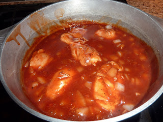 I used a combo of drumsticks, thighs, and breasts. I thought the drumsticks were the best. The breasts were definitely the least tender/moist. I bought them with bone-in and skin-on, but I had the butcher remove the skin. I feel like the sauce gets to the meat easier that way. Place the chicken in the pot and brown on all sides.